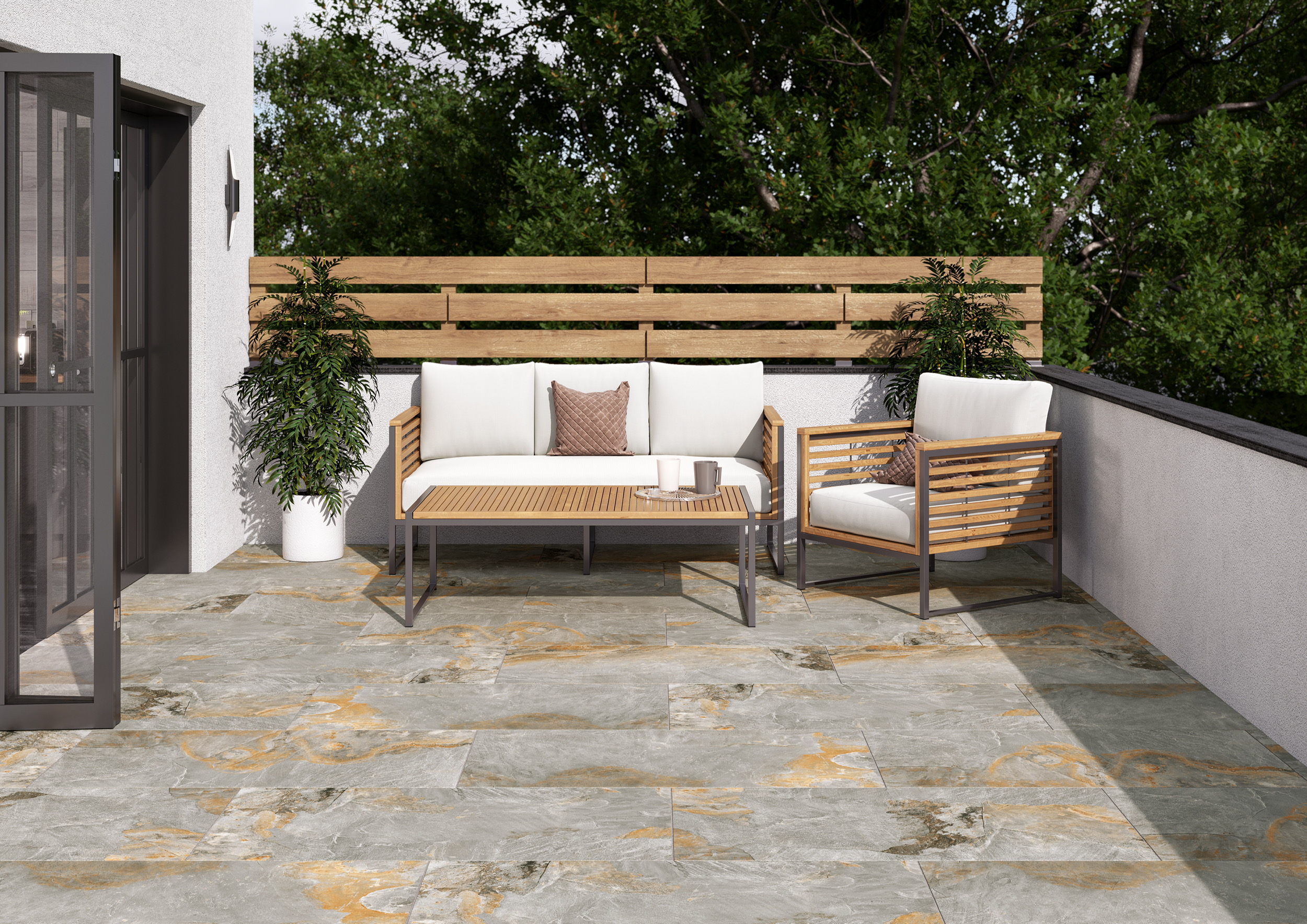 Ardesia Grey Slabs are a glazed beige and grey porcelain slab that offers your patio a beautiful base to light up your garden. They are a strong, reliable slab at £30.00m²+VAT for 10m² or over.