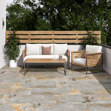 Ardesia Grey Slabs are a glazed beige and grey porcelain slab that offers your patio a beautiful base to light up your garden. They are a strong, reliable slab at £30.00m²+VAT for 10m² or over.